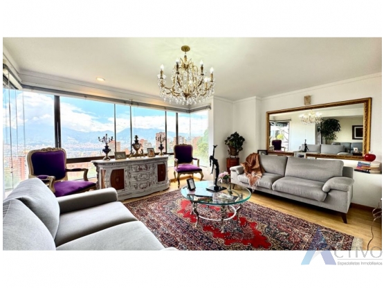 Este apartamento tiene un área construida de 160 m², distribuidos en cocina abierta remodelada, doble sala, comedor, zona de ropas, habitación de servicio, 3 habitaciones, 2 de ellas con baño y baño aparte para la otra habitacion auxiliar, balcón en el comedor y balcón en la sala de televisión con vista hermosa a Medellín.