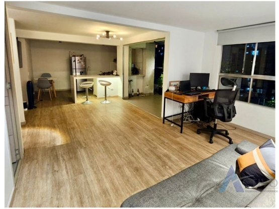 El apartamento tiene un área construida de 64 m², distribuidos en 2 habitaciones y se acondicionó para una sola habitación con estudio, 2 baños, amplio balcón con vista panorámica, cocina abierta con ventana integrada al balcón, zona de ropas.
